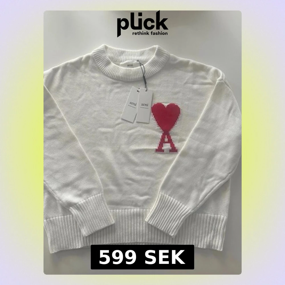 Vit stickad tröja från Ami med ribbad rund hals och muddar. På bröstet finns ett stort rött hjärta och bokstaven A i ett coolt mönster. Riktigt stilig nu till vinter