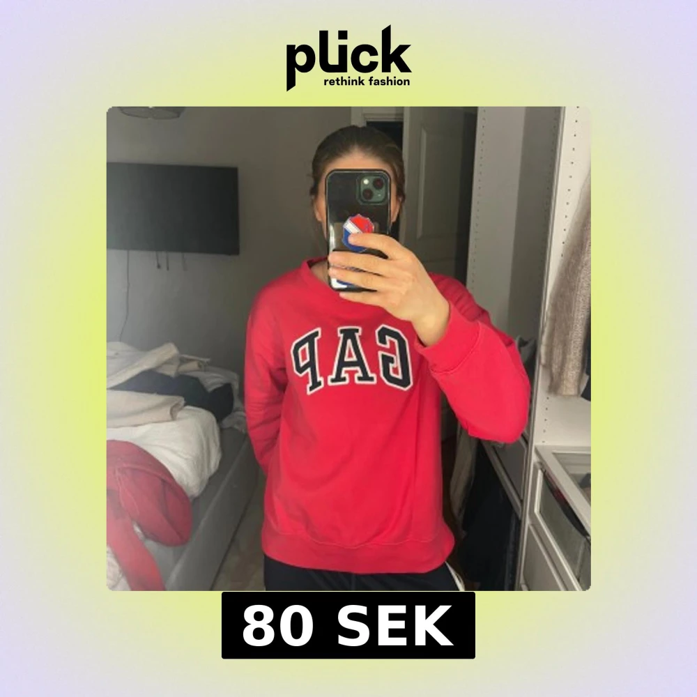 Röd sweatshirt från GAP med stor vit och svart logga framtill. Klassisk rund halsringning och ribbade muddar vid ärmslut och nederkant. Skön och avslappnad passform, perfekt till jeans eller mjukisbyxor. Materialet är mjuk bomullsmix.