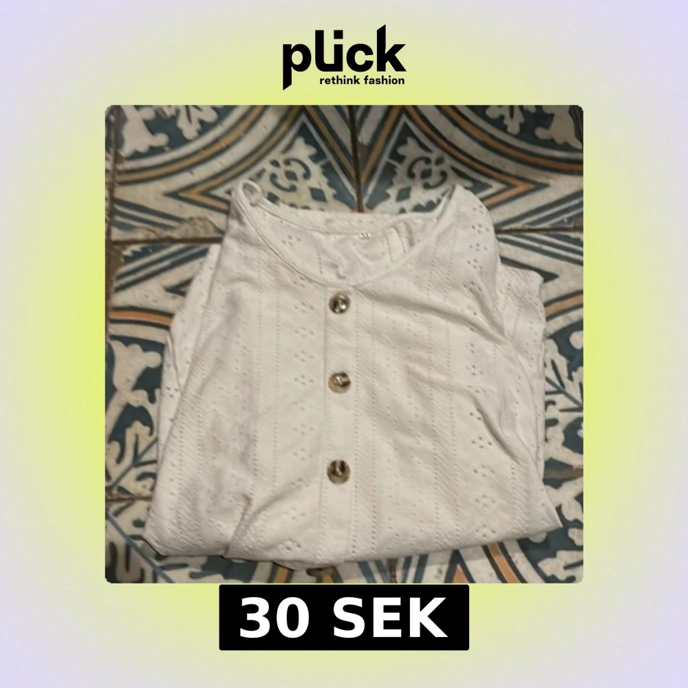Säljer en stilren vit blus med dekorativa knappar framtill. Blusen har ett diskret hålmönster och långa ärmar, perfekt för en elegant look.