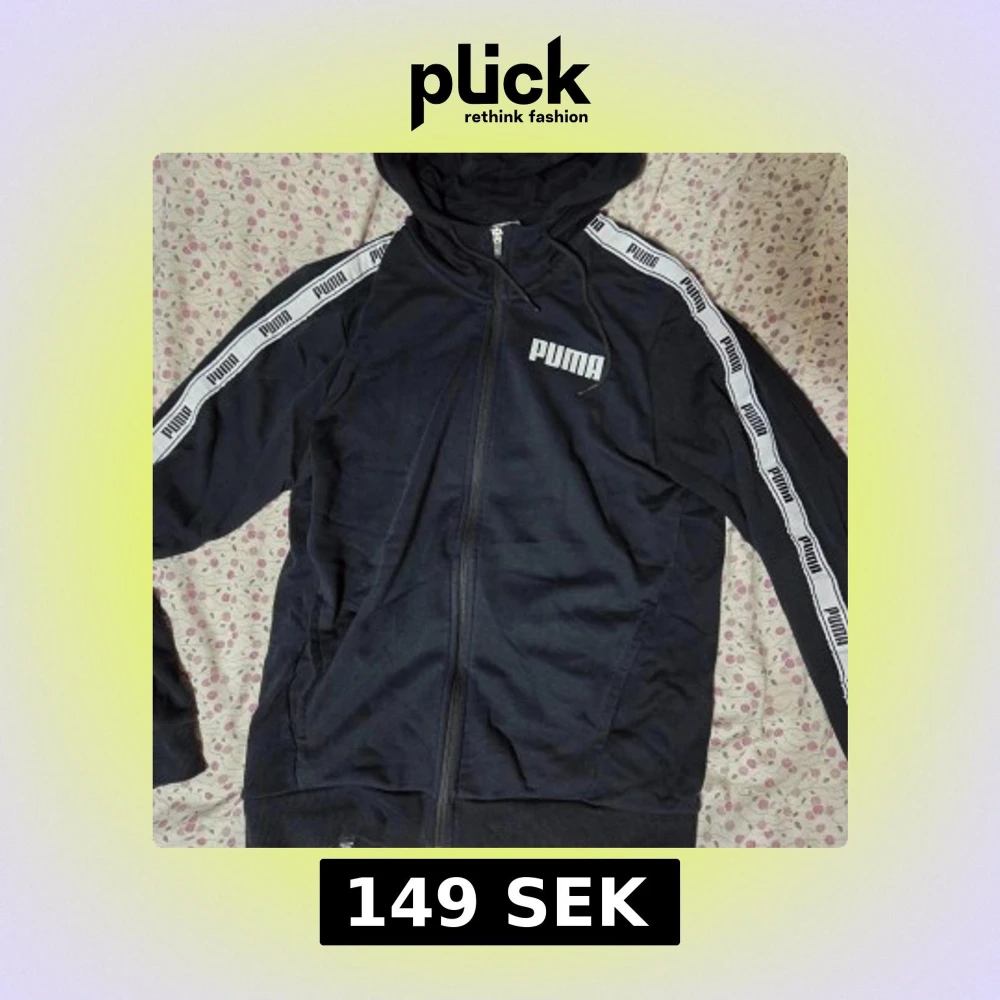 Svart hoodie från Puma med vit logga på bröstet och vita band med Puma-tryck längs ärmarna. Tröjan har huva med snörning, hel dragkedja och ribbade muddar. Perfekt för chill eller träning, snygg streetstil och bekväm passform.