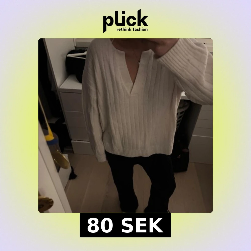 Säljer en stilren vit ribbad tröja med v-ringning. Tröjan har långa ärmar och en avslappnad passform, perfekt för en mysig dag. Passar bra till både jeans och kjol.