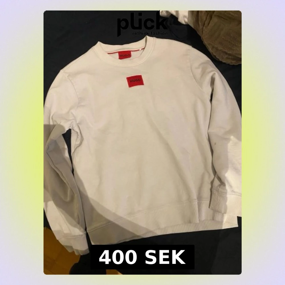 Vit sweatshirt från Hugo med röd logotyp-patch på bröstet. Klassisk rund halsringning och ribbade muddar vid ärmslut och nederkant. Perfekt för en clean och stilren look. Finns en liten fläck på armen som syns i bilden