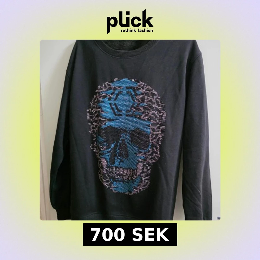 Cool svart sweatshirt med stort blått döskalletryck framtill i glittriga stenar. Tröjan har rund halsringning och långa ärmar. Mjuk insida i fleece och ribbade muddar vid ärmslut och nederkant. Perfekt för dig som gillar edgy streetstyle. Priset kan diskutera!!!!
