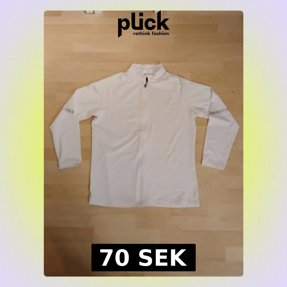 Vit långärmad träningströja i funktionsmaterial med halv dragkedja framtill och reflekterande mönster på ärmarna. Tillverkad i 95% polyester och 5% elastan, perfekt för löpning eller gym. Snygg och sportig look med hög krage. Känns som en large!