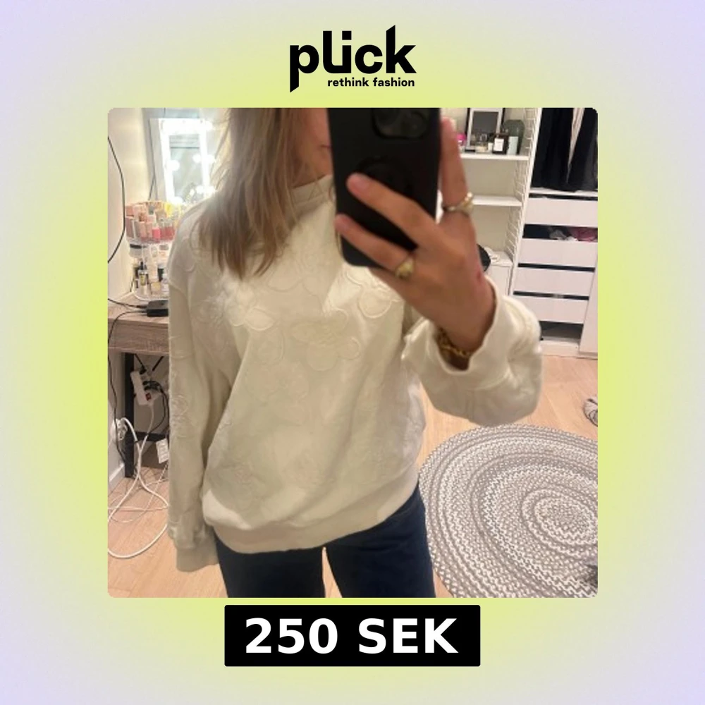 Säljer en vit sweatshirt med broderade blommor över hela tröjan. Den har rund hals, ribbade muddar och är långärmad. Materialet känns som mjuk bomull och passformen är normal, perfekt till jeans. Blommorna ger en fräsch och unik vibe.