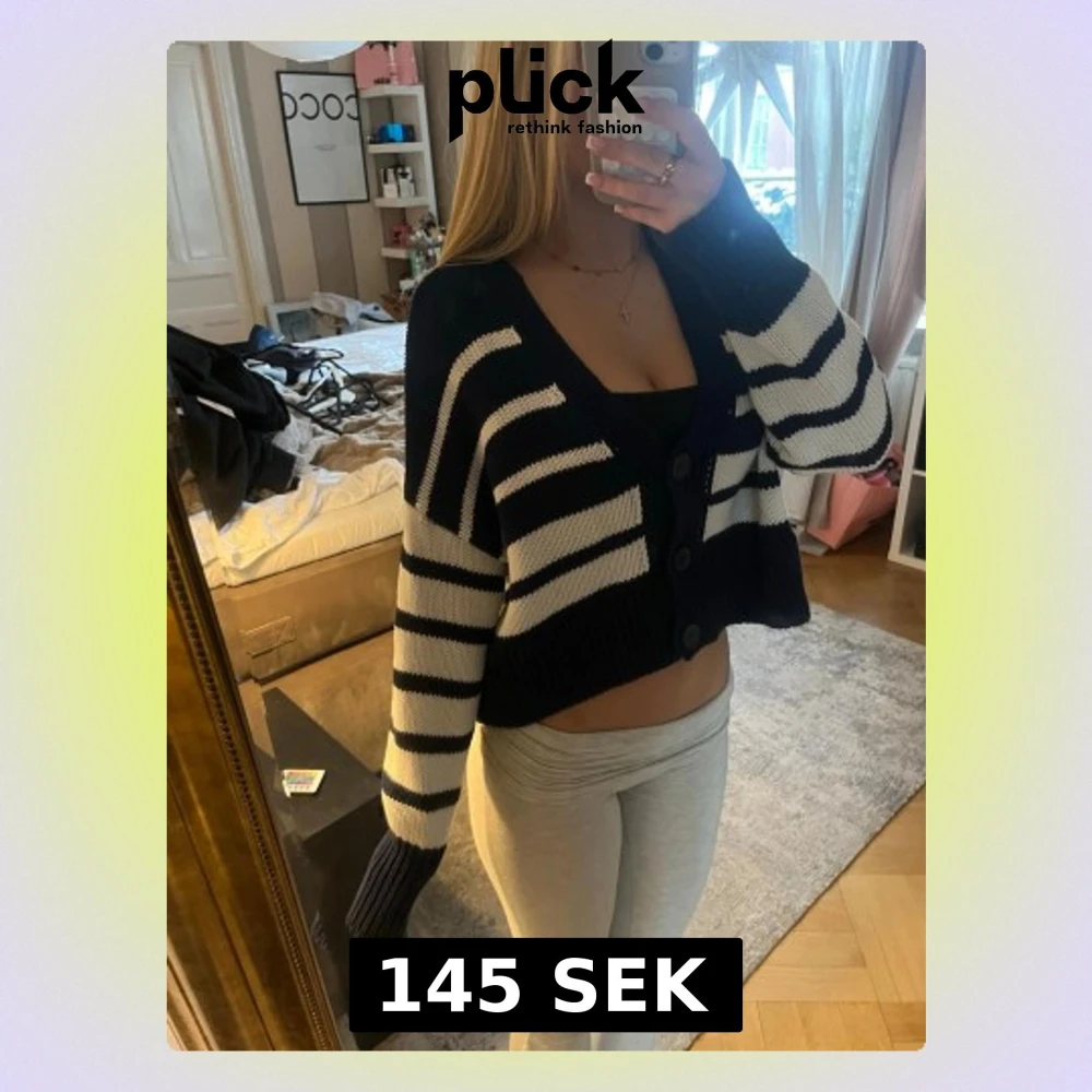 Trendig stickad kofta med breda marinblå och vita ränder. Koftan har djup v-ringning, stora knappar framtill och är croppad i modellen. Perfekt att slänga över ett linne för en avslappnad look.