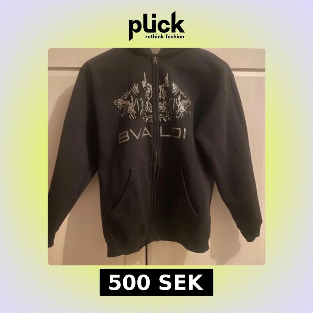 Snygg svart hoodie med dragkedja från Bvaldi. Den har ett coolt glittrigt mönster framtill på tre hundar och långa ärmar. Perfekt för en avslappnad stil.