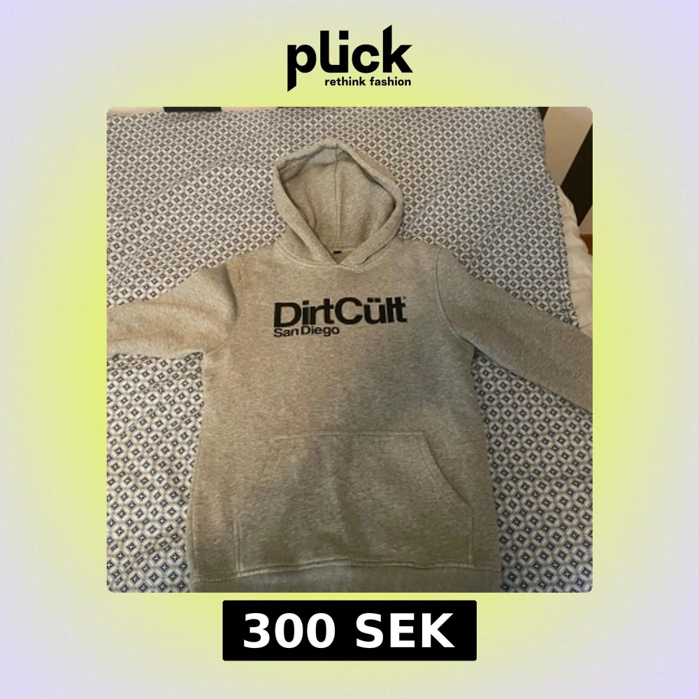 Säljer en grå hoodie från Dirt Cult med stor svart logga på bröstet och texten San Diego. Tröjan har huva, lång ärm och en stor magficka framtill. Perfekt för chill dagar och streetwear-stil.