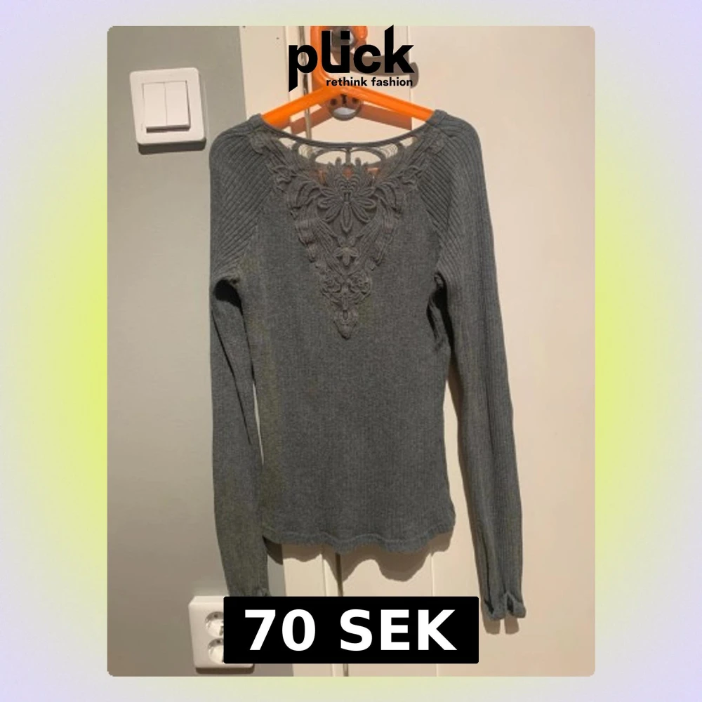 Snygg grå långärmad tröja med ribbad struktur och unik spetsapplikation i blommönster över bröstet och axlarna. Tröjan har rund halsringning och smal passform, perfekt för dig som gillar detaljer och stilren design. Bra skick!