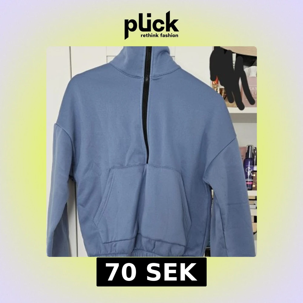 Säljer en blå hoodie med halv dragkedja och hög krage. Tröjan har en stor magficka och långa ärmar. Perfekt för en avslappnad stil och passar bra till jeans eller mjukisbyxor.