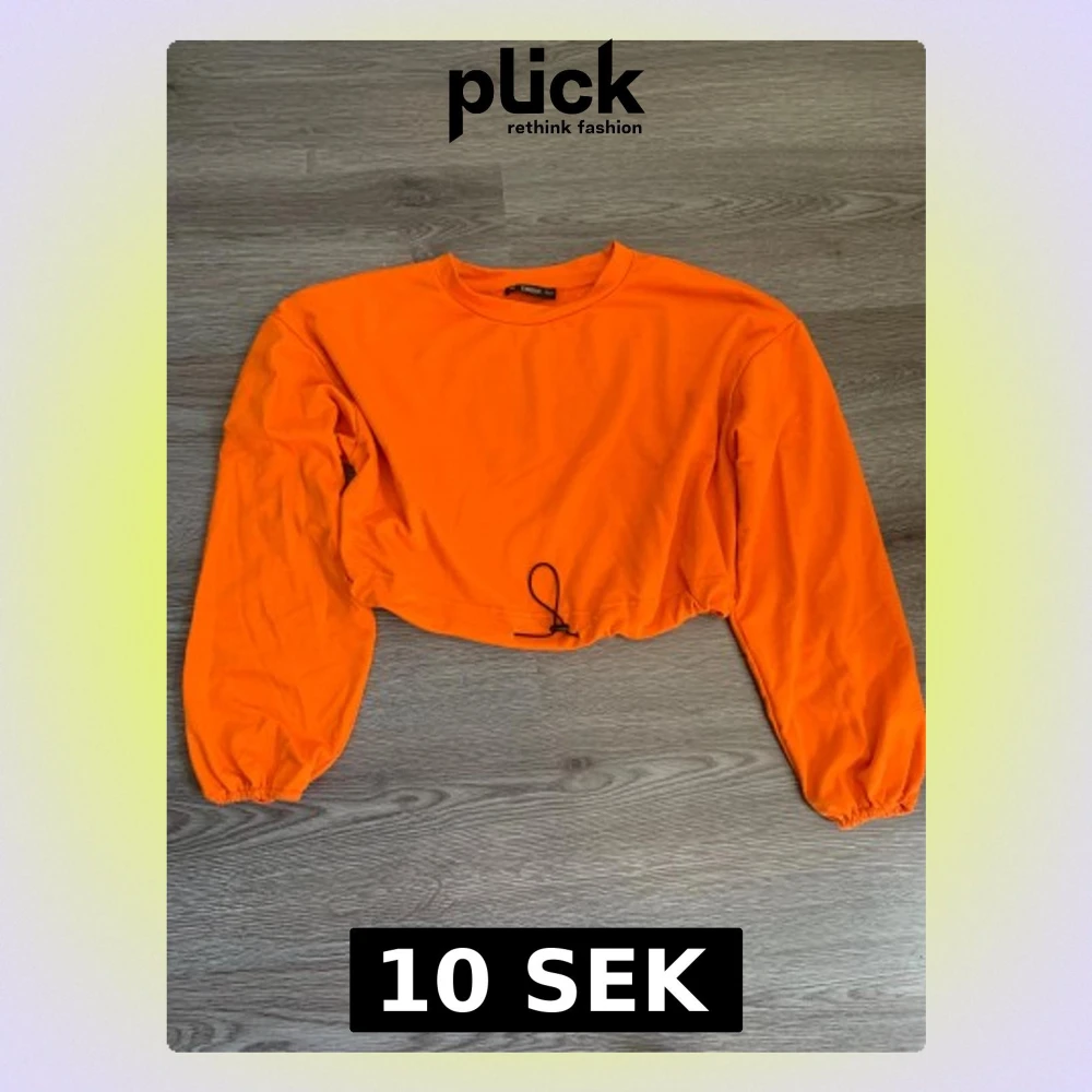 Säljer en croppad långärmad tröja från SHEIN i stark orange färg. Tröjan har rund hals, elastiska ärmslut och en snörning i nederkant för att justera passformen. Perfekt för dig som gillar färgstarka och trendiga plagg.