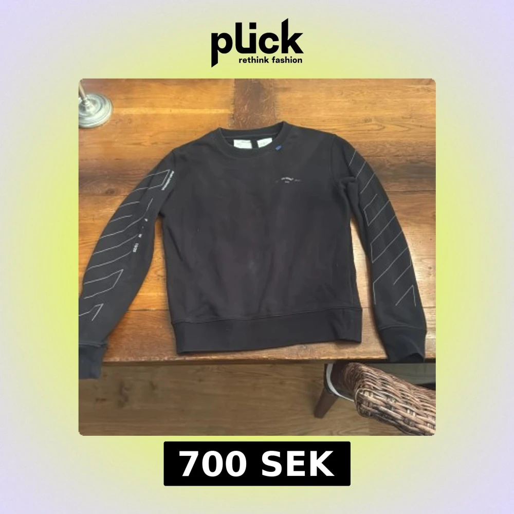 Svart sweatshirt från Off-White med ikoniska vita pilar och grafiska linjer på ärmarna och ryggen. Crewneck-modell i bomull med ribbade muddar och diskreta logodetaljer framtill och baktill. Perfekt för dig som gillar streetwear och vill sticka ut.