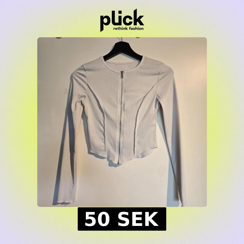 Säljer en vit ribbad långärmad tröja med dragkedja framtill. Tröjan är croppad med lätt vågig nederkant och har en tight passform. Perfekt för dig som gillar stilrena och trendiga plagg med snygga detaljer. Använd 2 gånger