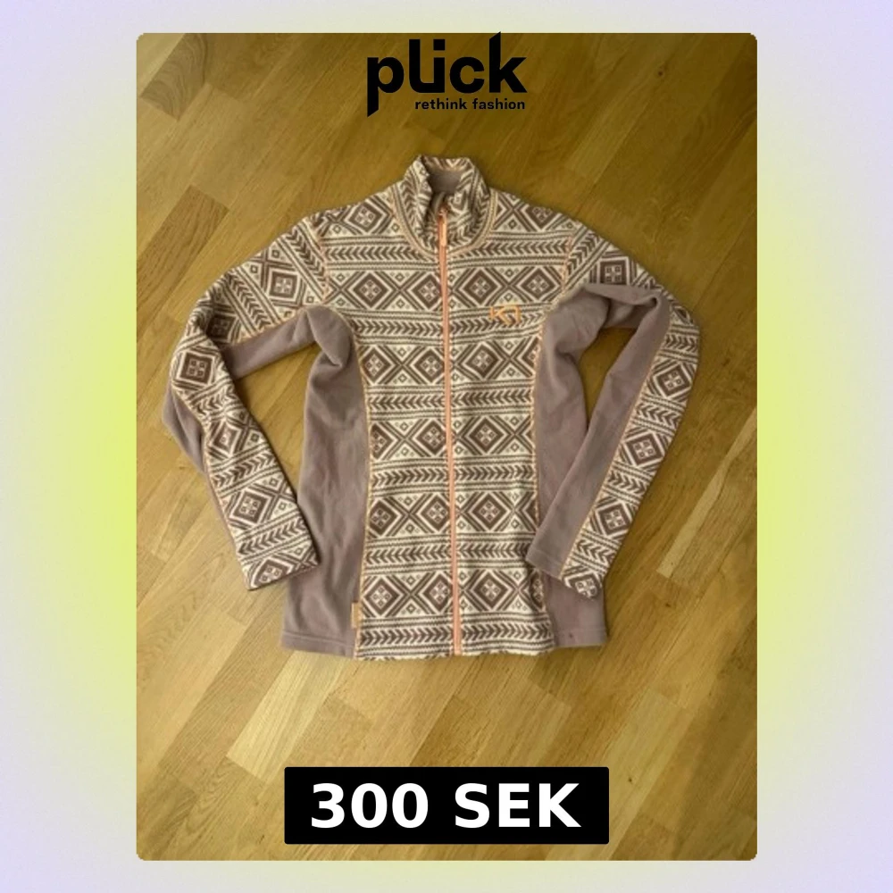 Superskön fleecejacka från Kari Traa i ljuslila och beige med snyggt nordiskt mönster. Jackan har hel dragkedja, hög krage och långa ärmar. Perfekt lager-på-lager och riktigt mjuk mot huden. Kari Traa-logga på bröstet. Den är helt ny, enbart testad så mycket fint skick