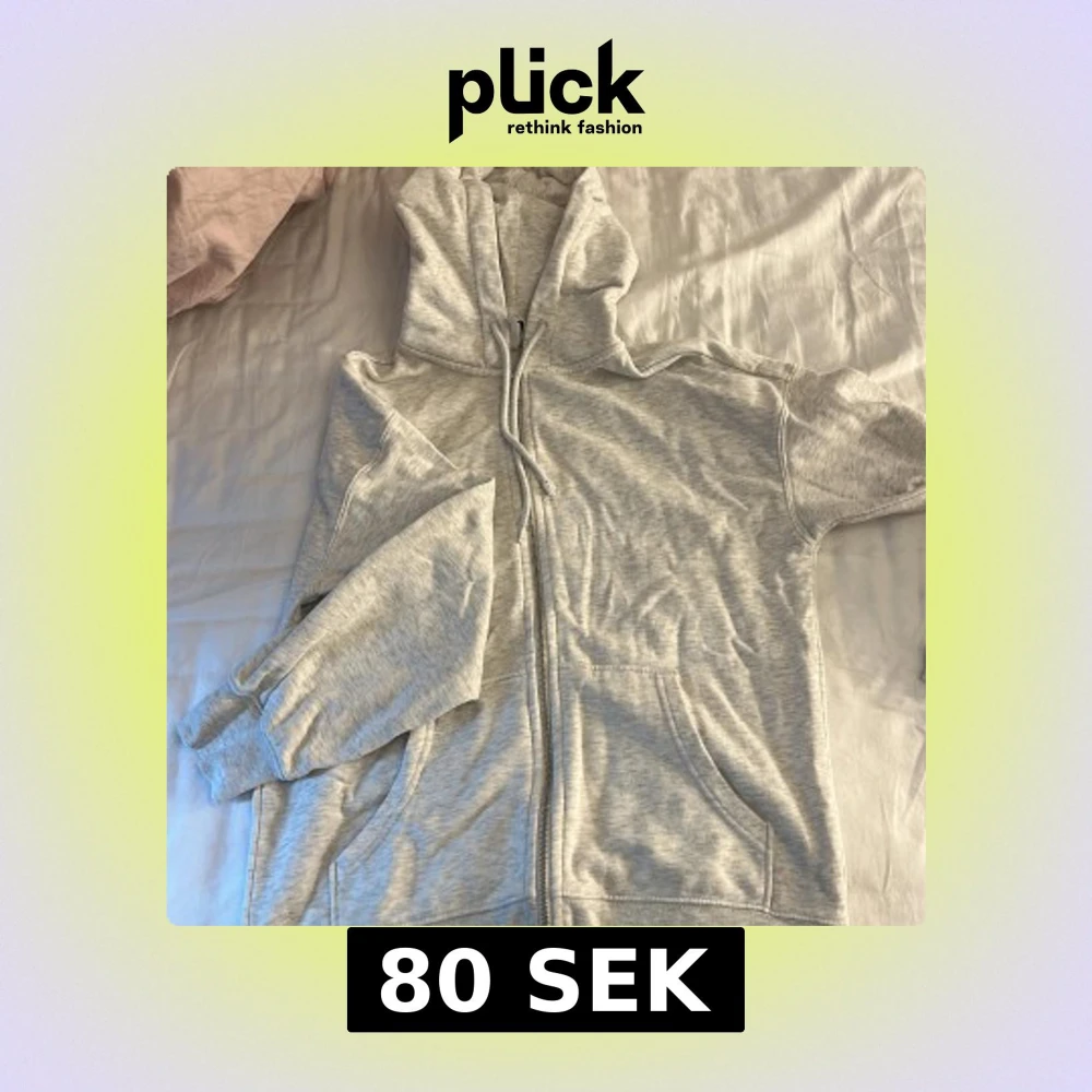Ljusgrå hoodie i storlek XS med dragkedja framtill, huva med snörning och två fickor. Mjuk och skön, perfekt för chill dagar. Klassisk modell med ribbade muddar vid ärmslut och nederkant. Den är oversized