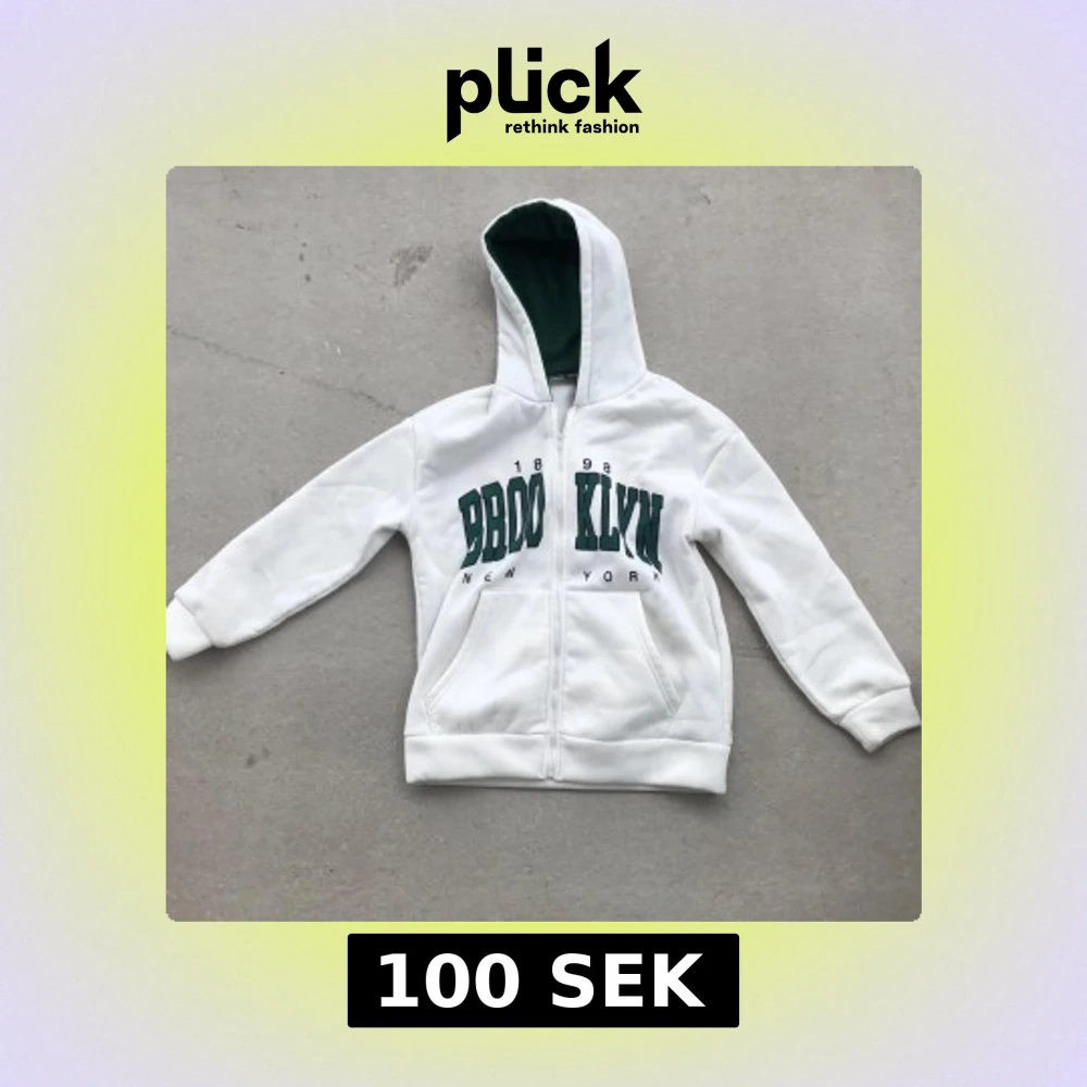 Vit hoodie med dragkedja från SHEIN, stor grön text 'BROOKLYN' framtill och mörkgrönt foder i huvan. Klassisk college-stil med känguruficka och långa ärmar. Perfekt för chill dagar eller när du vill ha en sportig vibe.