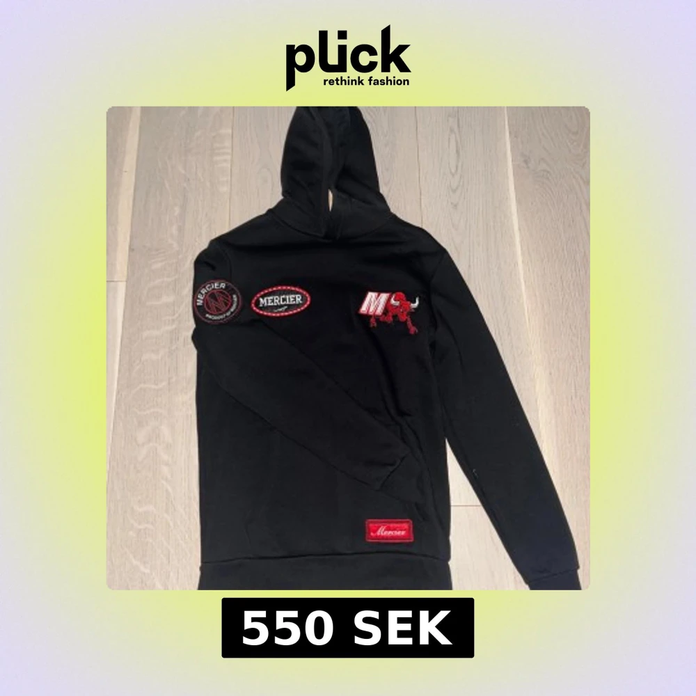 Svart hoodie från Mercier i storlek XS med röda och vita broderade patches och loggor på bröstet, ärmen och ryggen. Tröjan har huva, långa ärmar och en klassisk loose passform. Perfekt för dig som gillar streetwear och snygga detaljer. Har ej använt den.