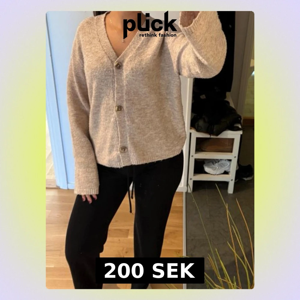 Mysig beige kofta med v-ringning och stora knappar framtill. Koftan har lång ärm och är tillverkad i ett mjukt, stickat material som ger en avslappnad look. Perfekt att slänga på sig över en t-shirt eller linne.