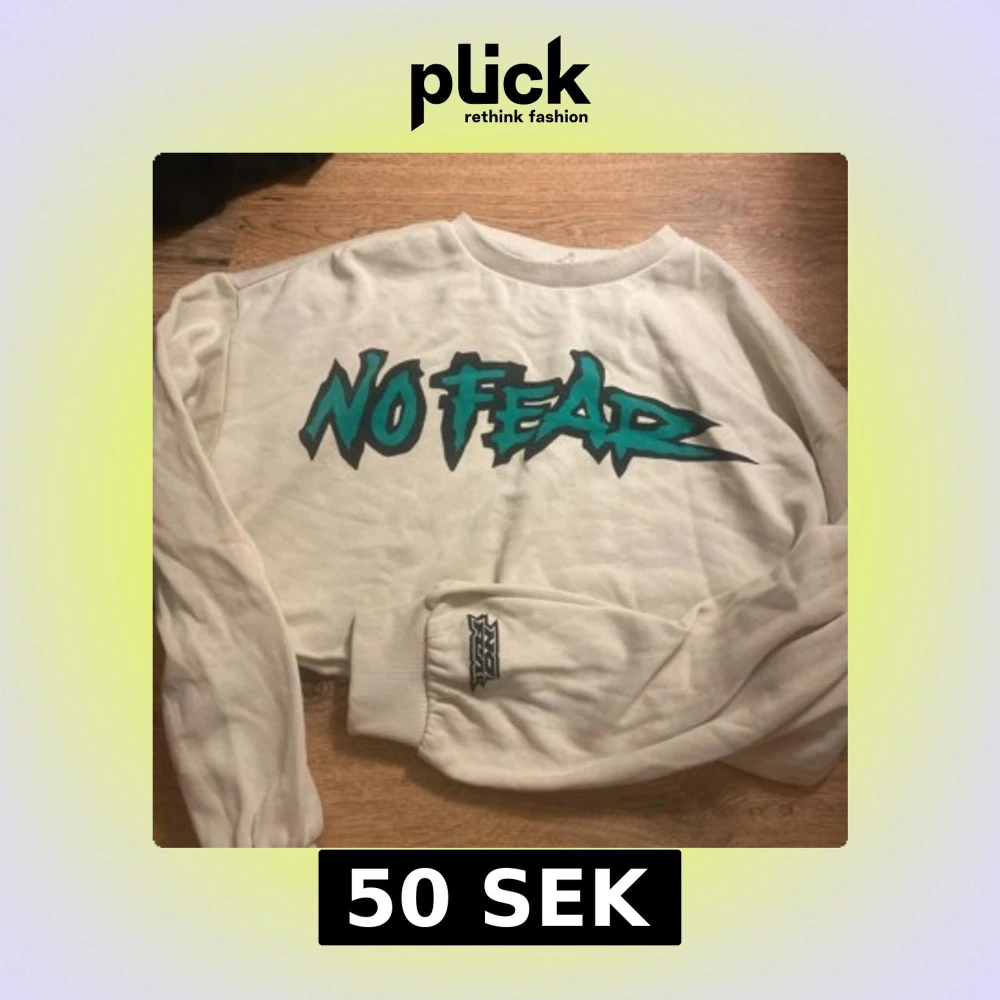 Säljer en vit croppad sweatshirt från No Fear med stort turkost och svart tryck på bröstet. Tröjan har långa ärmar, ribbade muddar och en relaxed passform. Perfekt för dig som gillar streetstyle och vill sticka ut med en bold logga.
