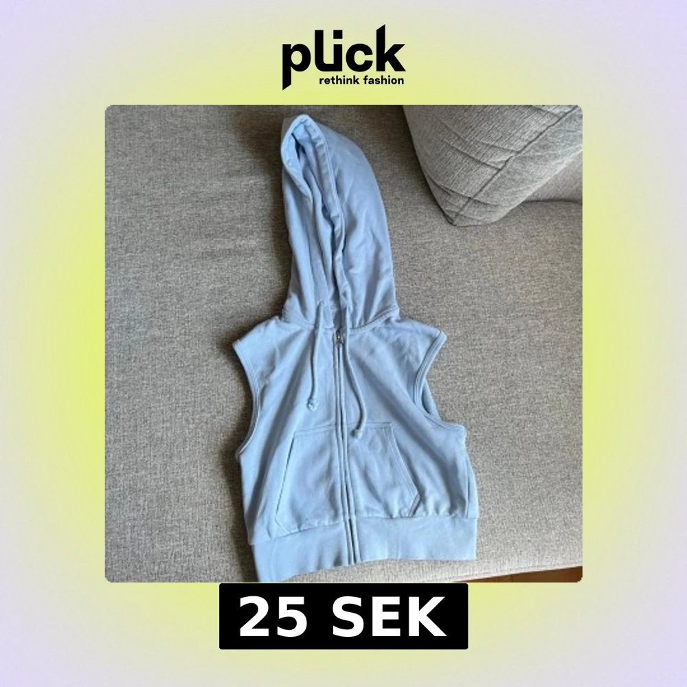 Ljusblå ärmlös hoodie-väst från H&M Divided i storlek XS. Västen har dragkedja framtill, två fickor och en stor huva med dragsko. Perfekt för lager-på-lager och chill stil.😙