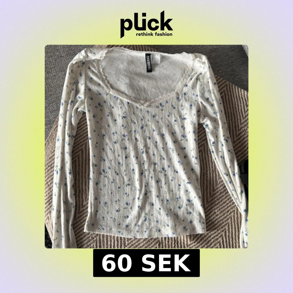Supersöt långärmad topp från H&M Divided i vitt med små blå blommor. Toppen har ribbad struktur, spetskant vid halsringningen och en feminin v-ringad form. Perfekt för dig som gillar romantisk och söt stil.