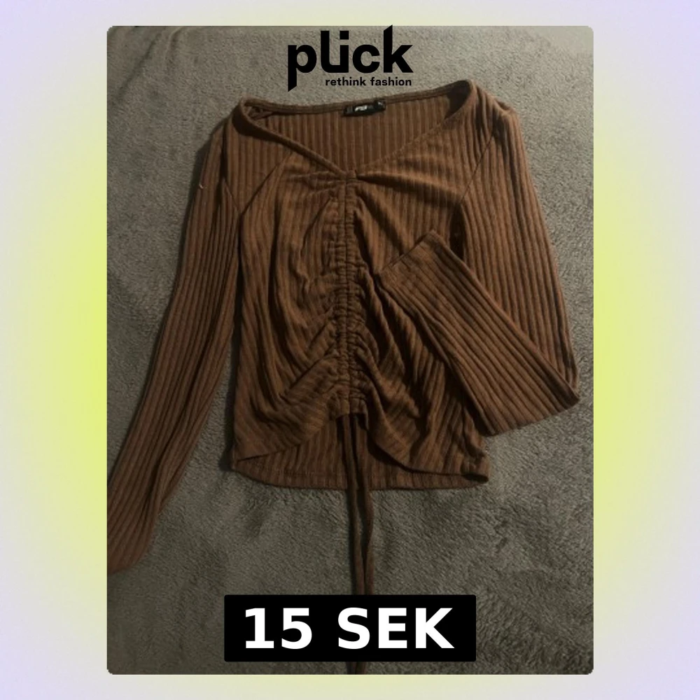 Säljer en brun långärmad topp med ribbad struktur och snygg snörning framtill. Toppen har omlott-look och v-ringad hals.
