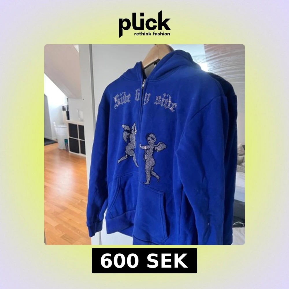 Säljer en blå hoodie med dragkedja och ett unikt tryck av två änglar på framsidan. Texten 'Side by side' är tryckt ovanför i ett stilfullt typsnitt. Perfekt för en avslappnad stil. Det är rhinestone material och kommer från företaget side by side