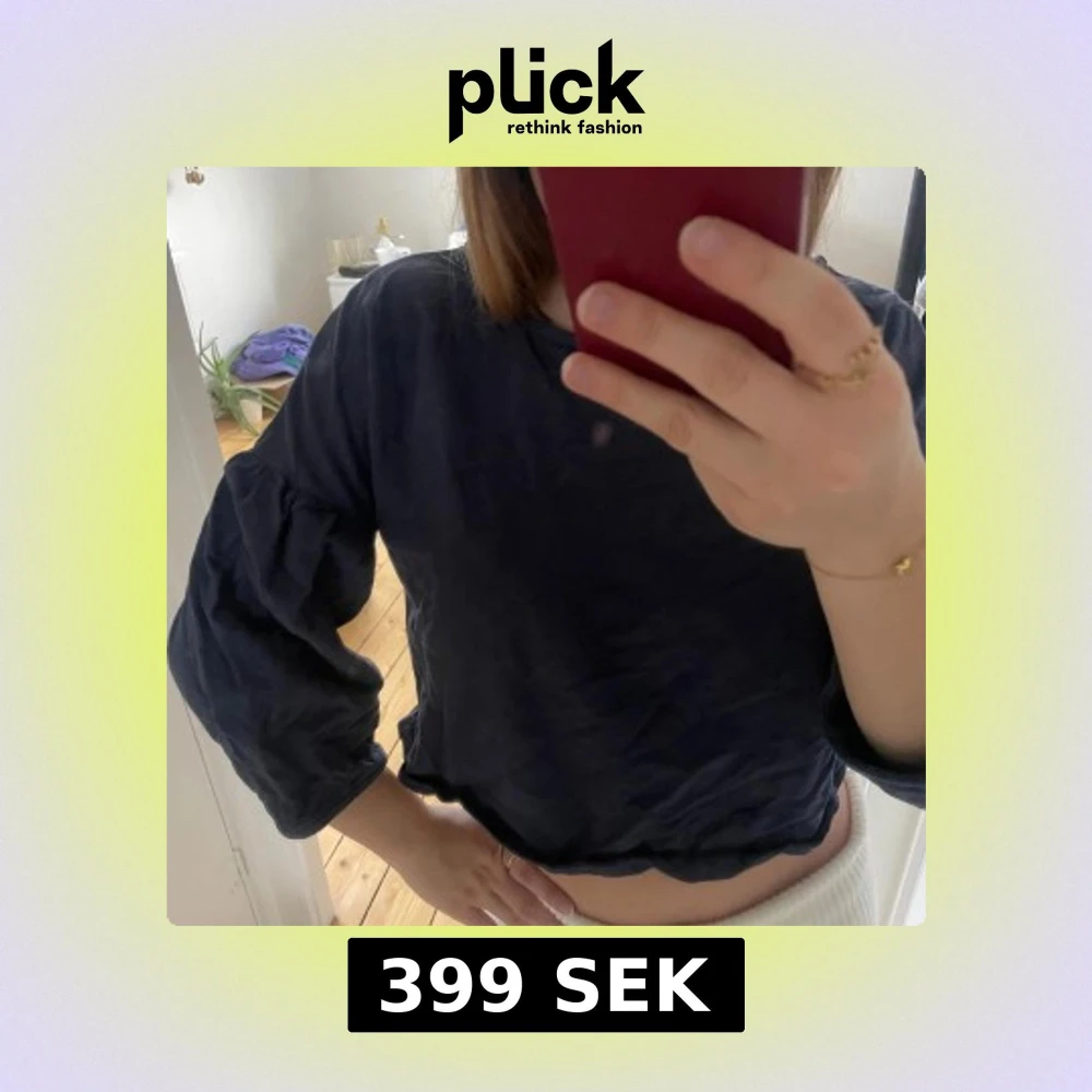 Snygg svart blus med trekvartsärm och puffiga ärmar. Perfekt för en stilren look. Blusen har en lös passform och är croppad, vilket ger en modern touch.