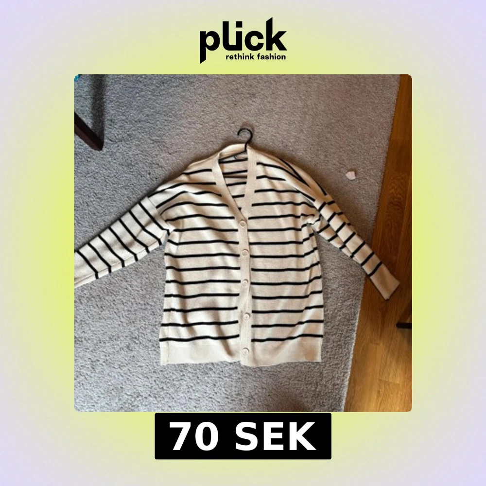 Säljer en stilren randig kofta i beige med svarta ränder. Koftan har långa ärmar och knappar framtill. Perfekt för en avslappnad look.