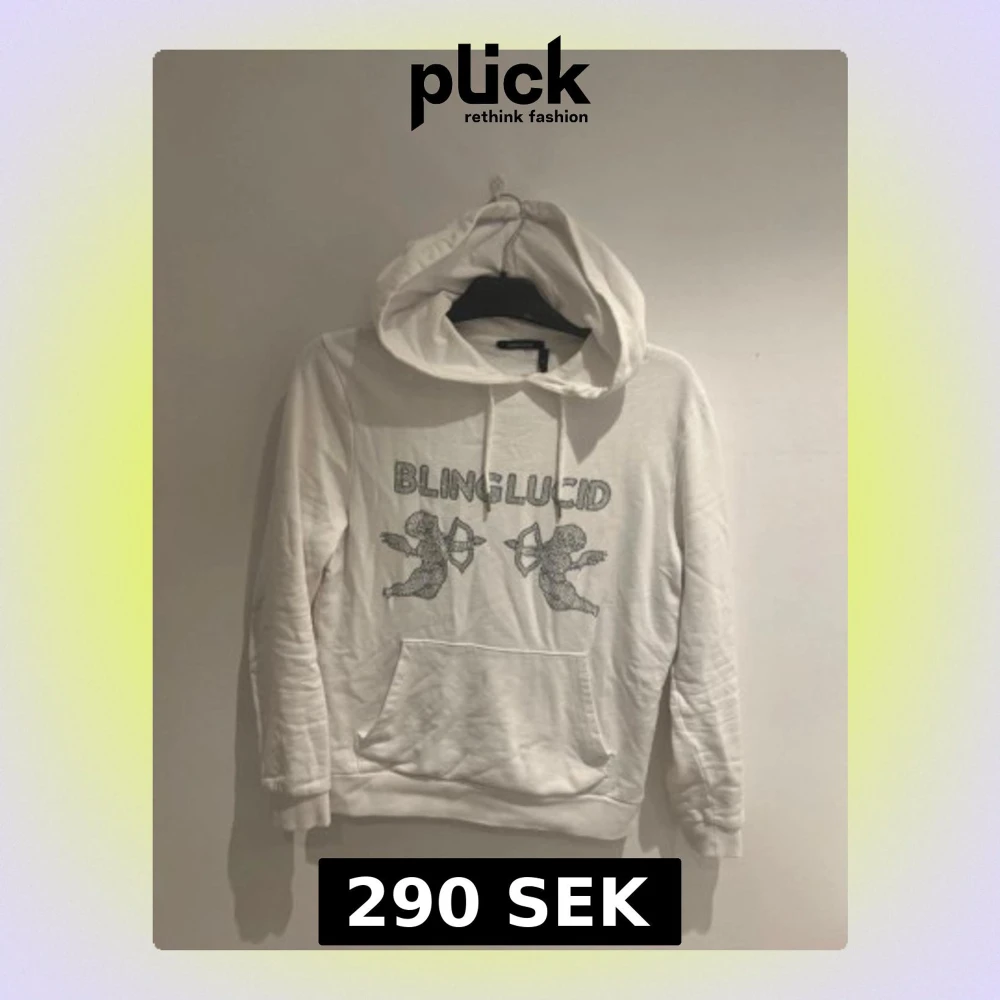 Vit hoodie från Blinglucid i storlek XS med coolt print framtill av två änglar och texten BLINGLUCID. Tröjan har huva med snörning och en stor magficka. Perfekt för dig som gillar streetwear och vill sticka ut lite extra.