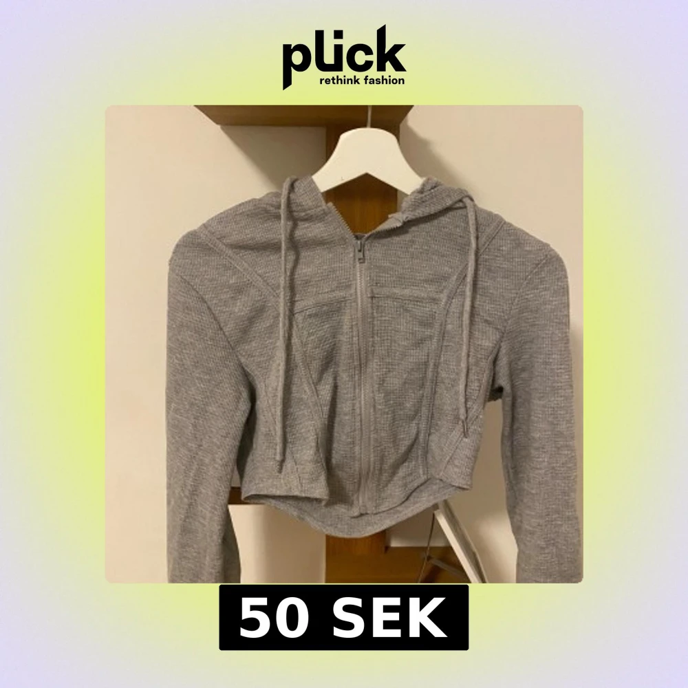 Grå croppad hoodie från SHEIN med ribbad struktur och dragkedja framtill. Tröjan har huva med snörning och långa ärmar, perfekt för en chill och avslappnad stil. Materialet är mjukt och stretchigt, vilket gör den skön att bära. Passformen är normal.