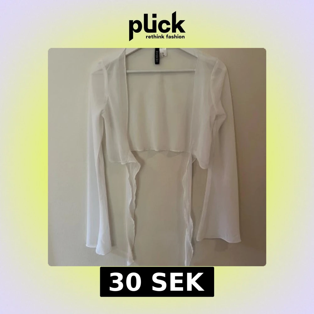 Säljer en supertunn och transparent vit kofta från H&M Divided. Den är croppad, har långa ärmar och öppet framtill med vågiga kanter. Perfekt att slänga över ett linne eller klänning för en lätt och luftig look.