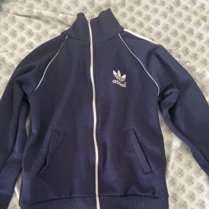 Säljer denna mörkblå adidaskoftan/jackan med vita detaljer. I storlek medium. 🫶