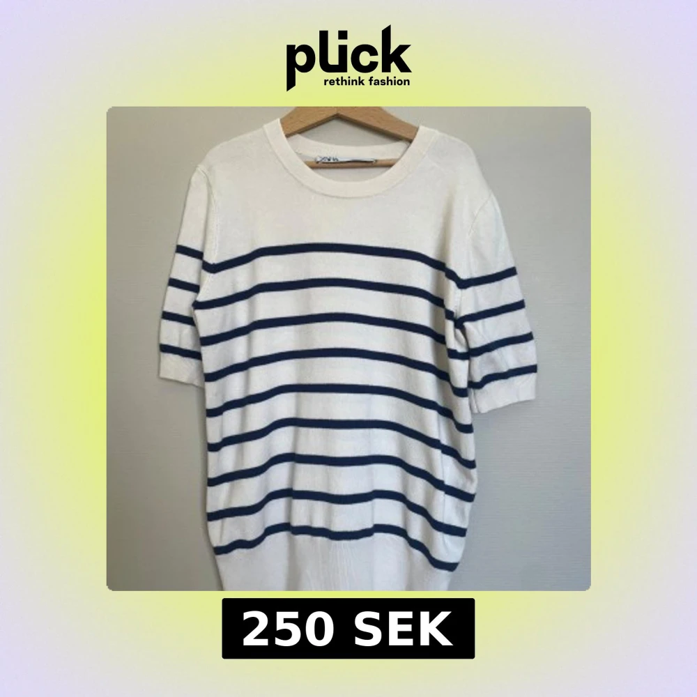 Säljer en vit tröja med marinblå horisontella ränder från Zara. Tröjan har rund halsringning och korta ärmar. Perfekt för en stilren och klassisk look.