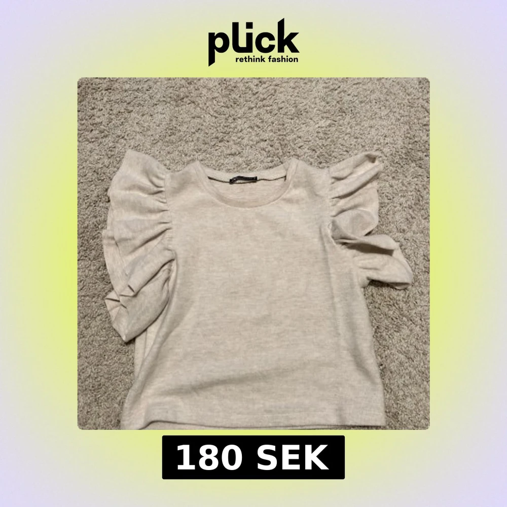 Säljer en beige topp från Zara med volangärmar. Toppen har en normal passform och är tillverkad i ett mjukt material.