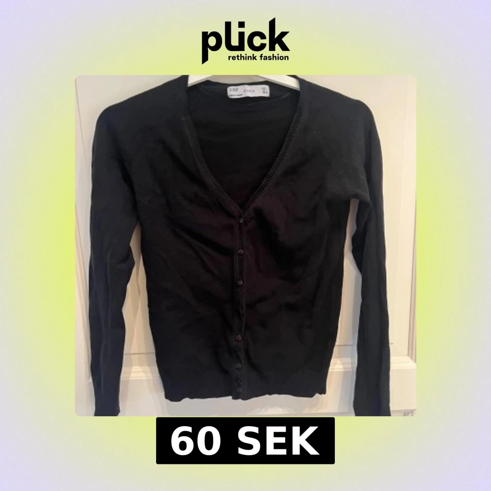 Svart kofta från Zara med v-ringning och knappar hela vägen framtill🫶🏼🫶🏼Storlek L i barn storlek så skulle uppskatta att den sitter som en S/XS i dam storlek!!