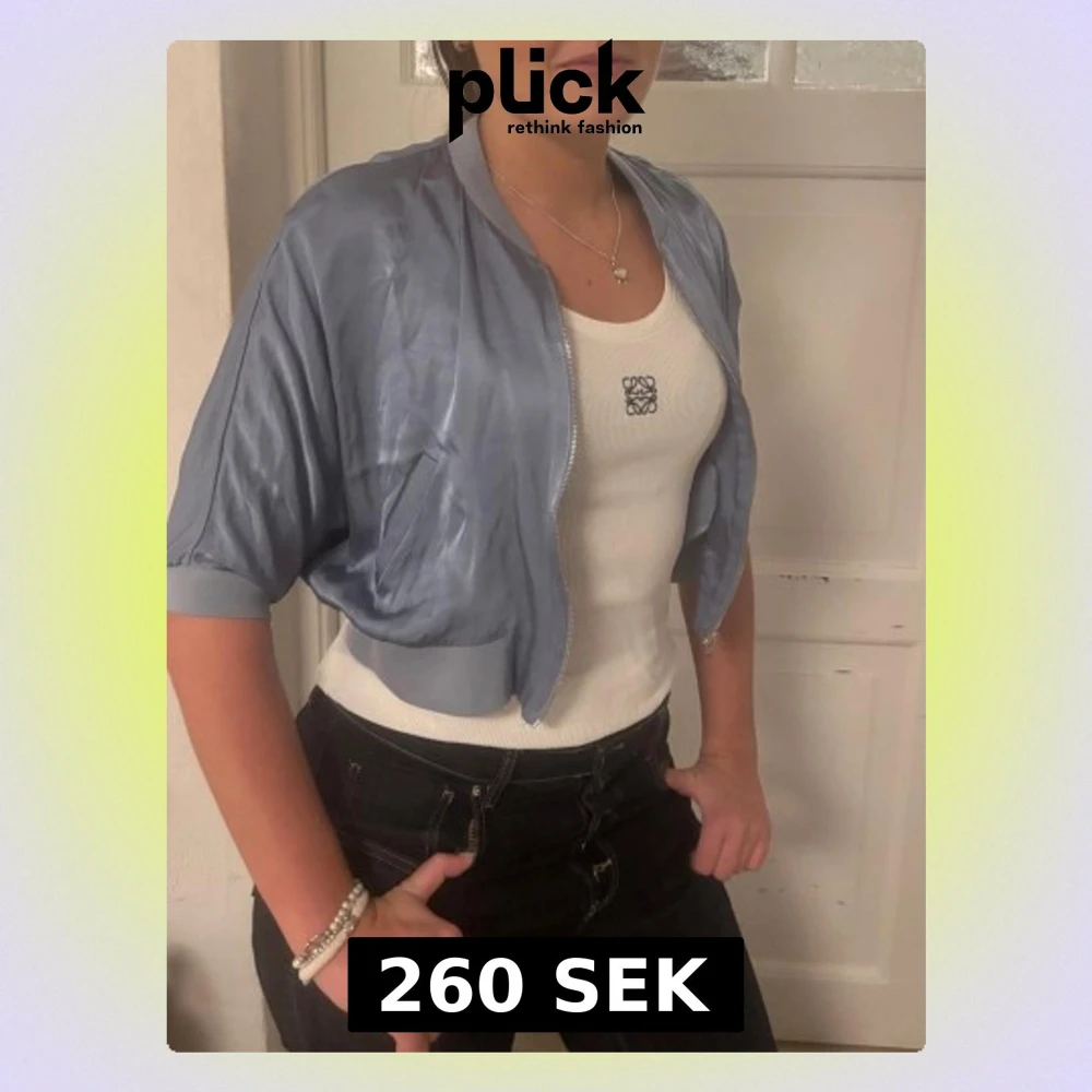Snygg ljusblå bolero i satinliknande material med korta ärmar och ribbade muddar. Croppad modell som passar perfekt över linne eller klänning för en trendig lager-på-lager-look. Dragkedja framtill och avslappnad passform.