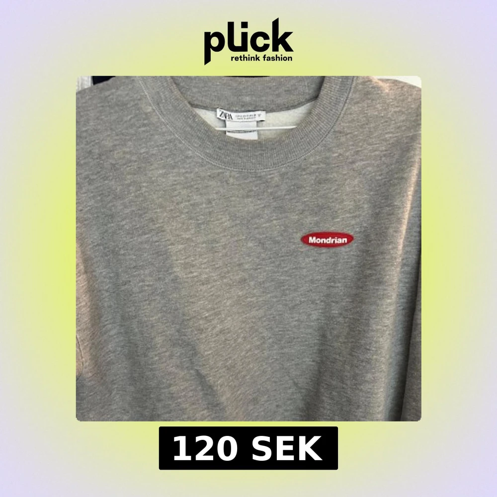 Grå sweatshirt från Zara med Mondrian-tryck på ryggen och liten röd Mondrian-logga framtill. Klassisk rund halsringning och mjukt material.
