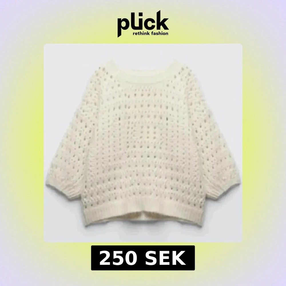 Säljer en vit stickad tröja med hålmönster och rund hals. Tröjan har trekvartsärmar och ribbade muddar vid ärmslut och nederkant.