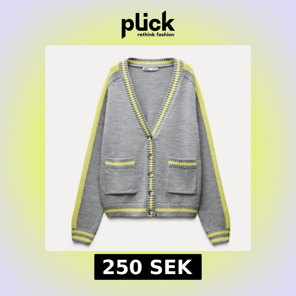 Grå kofta från Zara med gula och ljusgrå ränder längs kanter och ärmar. Köpte men aldrig använd, orkade itne lämna tillbaka därav nytt skick