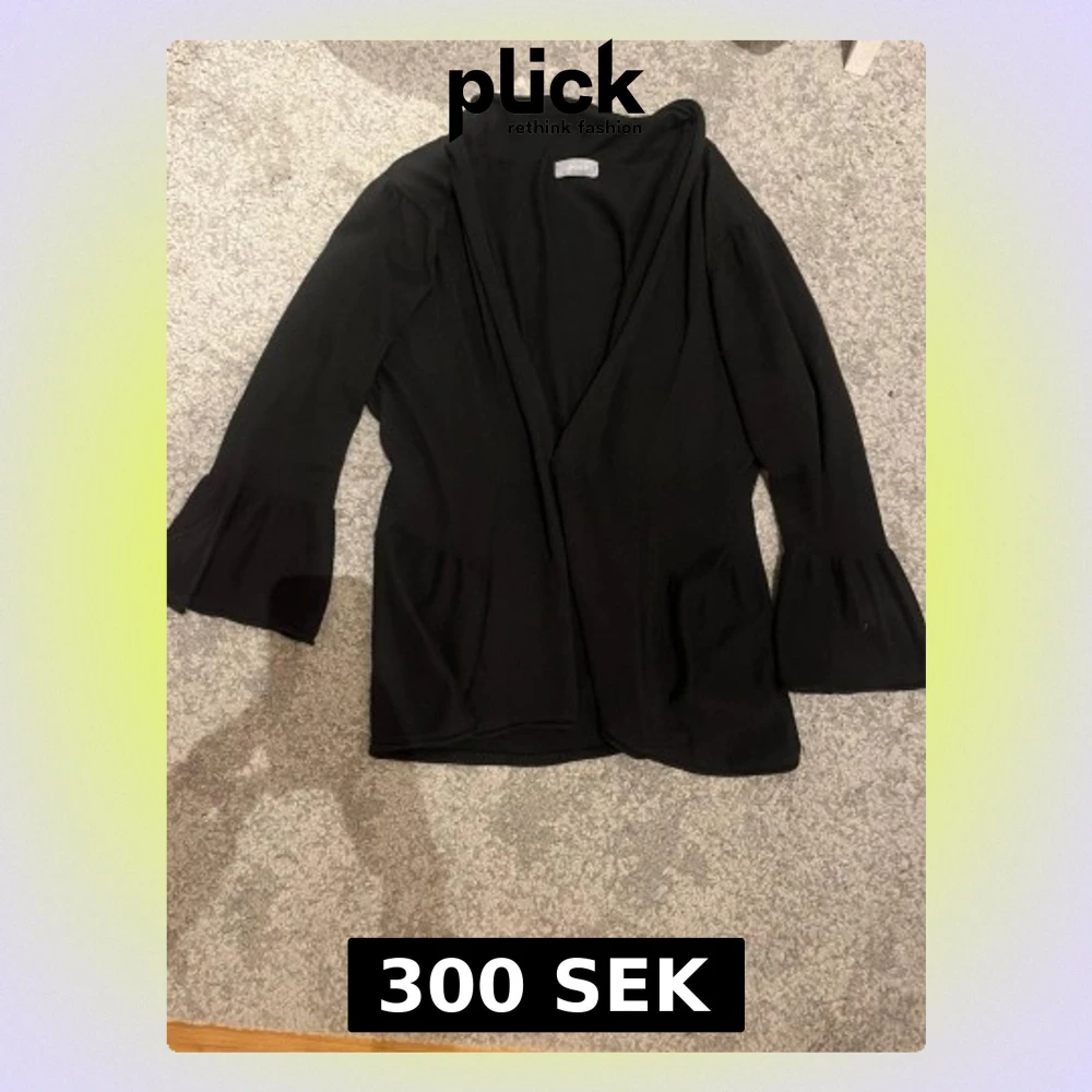 Stilren svart kofta från ZARA med vida trumpetärmar och öppen front. Koftan har två fickor framtill och är gjord i ett mjukt, tunt material som faller snyggt. Perfekt att slänga över en topp för en enkel men trendig look.