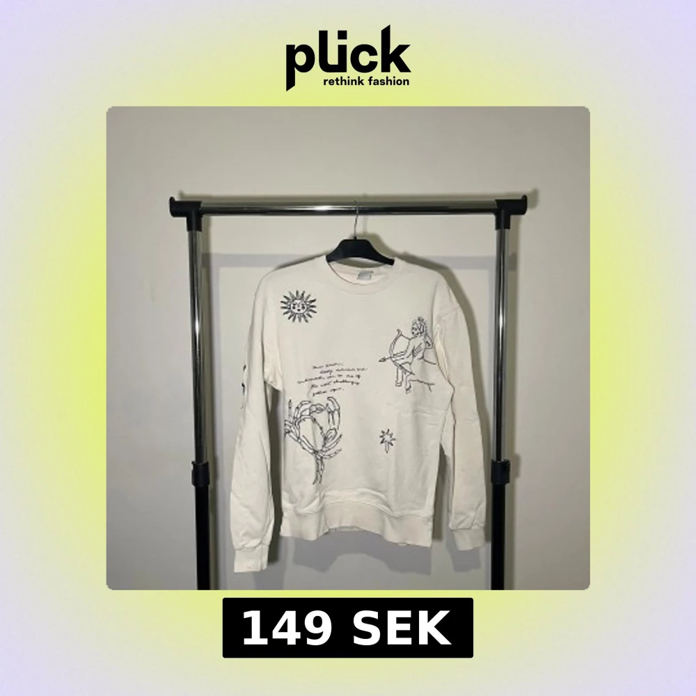 Säljer en vit tröja från Zara med unika tryck av sol och ansikten. Tröjan har långa ärmar och en rund halsringning. Perfekt för en stilren och konstnärlig look.