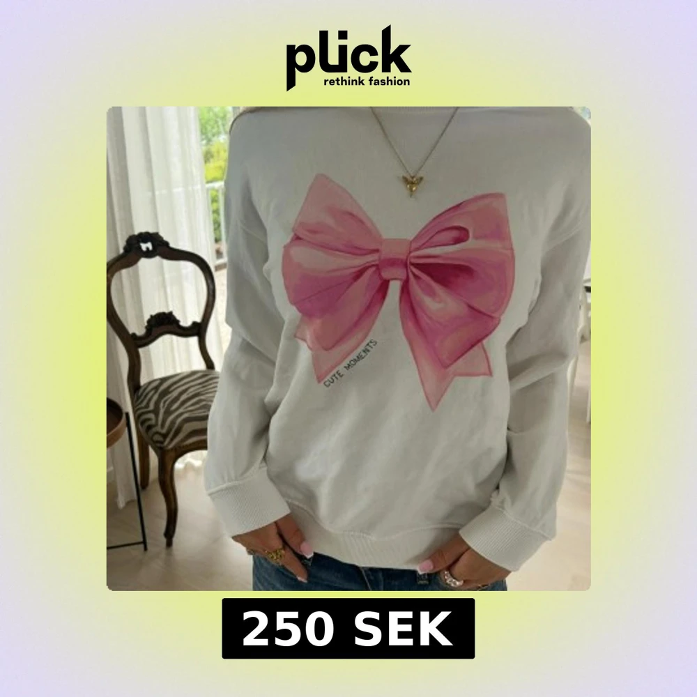 Vit sweatshirt med en stor rosa rosett framtill och texten 'Cute Moments' under motivet. Tröjan har rund hals, långa ärmar och ribbade muddar. Perfekt för dig som gillar söta och trendiga detaljer. ❤️❤️