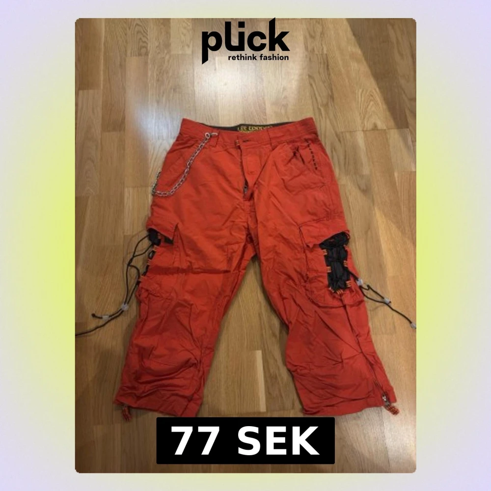 Säljer ett par orange cargobyxor med cool kedjedetalj i midjan, svarta snörningar på sidorna och flera fickor. Byxorna har dragkedjor vid bensluten och är perfekta för en streetwear-look. Materialet är bomull och de har en avslappnad passform.