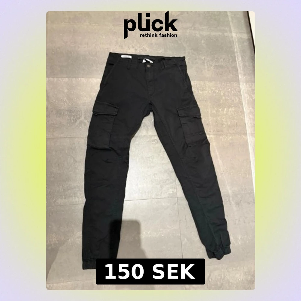 Svarta cargobyxor med flera stora fickor på sidorna och resår vid bensluten. Byxorna har en avslappnad passform och stängs med knapp och dragkedja. Perfekta för en streetwear-look och praktiska med sina många fickor.