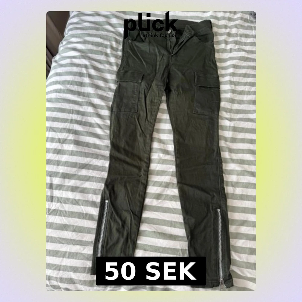Säljer ett par mörkgröna cargobyxor med raka ben, stora fickor på sidorna och dragkedjor vid bensluten. Byxorna har knapp och dragkedja i midjan samt bälteshällor. Perfekta för en cool och avslappnad stil.