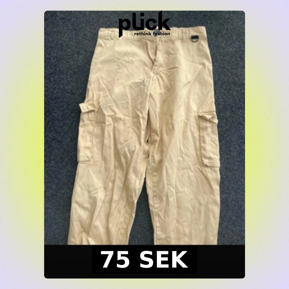 Säljer ett par beige cargobyxor med klassiska stora sidofickor och rak passform. Byxorna har bälteshällor och stängs med knapp och dragkedja. Perfekta för en avslappnad och trendig stil. Materialet ser ut att vara bomull eller bomullsblandning.