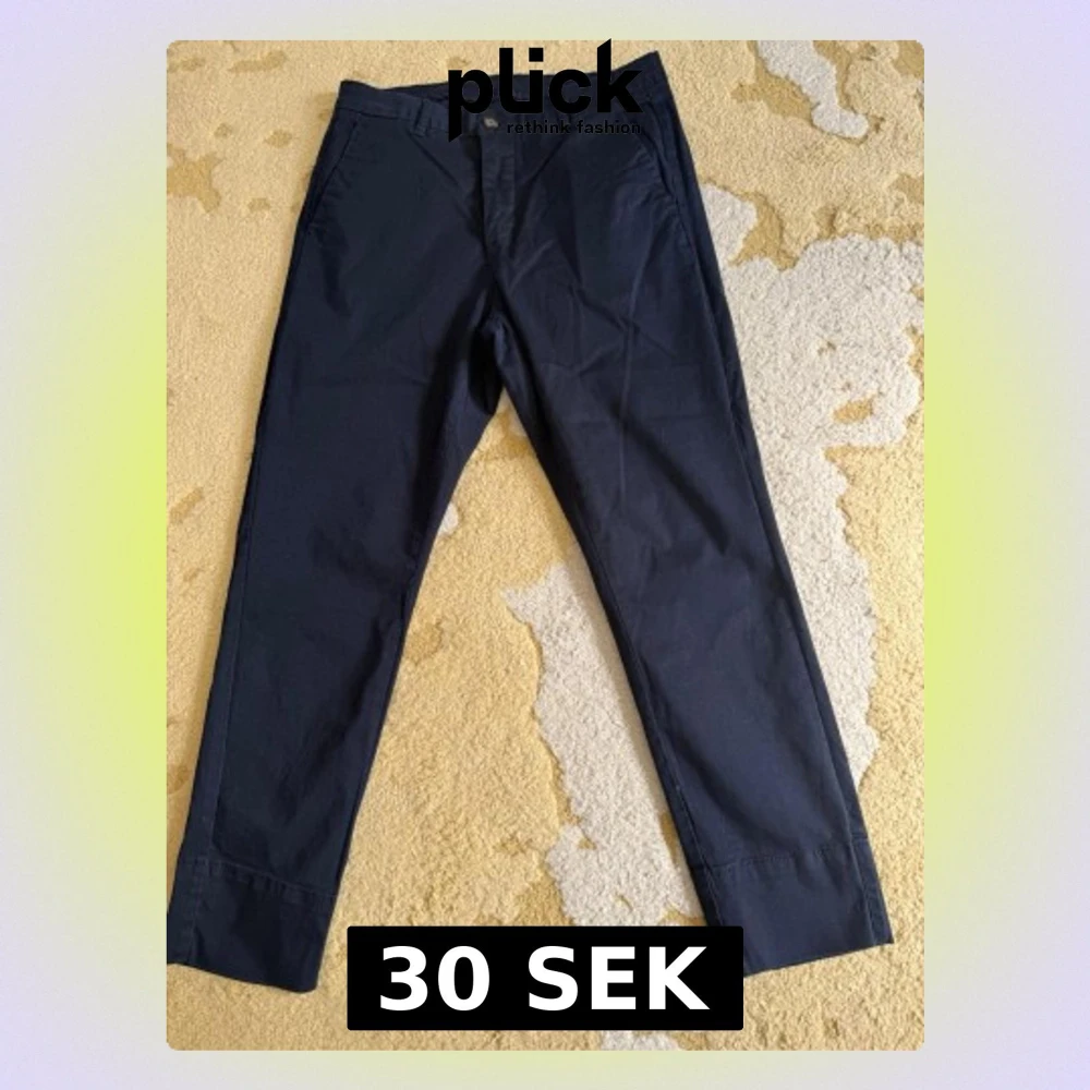 Snygga mörkblå chinos med klassisk rak passform och diskreta fickor i sidorna. Byxorna har en stilren look och är tillverkade i ett mjukt bomullstyg som känns bekvämt hela dagen. Perfekta för dig som gillar en clean och enkel stil.