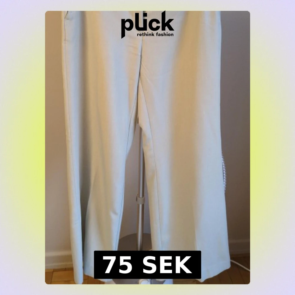Snygga beige kostymbyxor med hög midja och vida ben. Byxorna har bälteshällor och sidofickor, vilket ger en clean och modern look. Perfekta för dig som gillar minimalistisk stil och vill ha ett par byxor som sticker ut utan att vara för mycket.