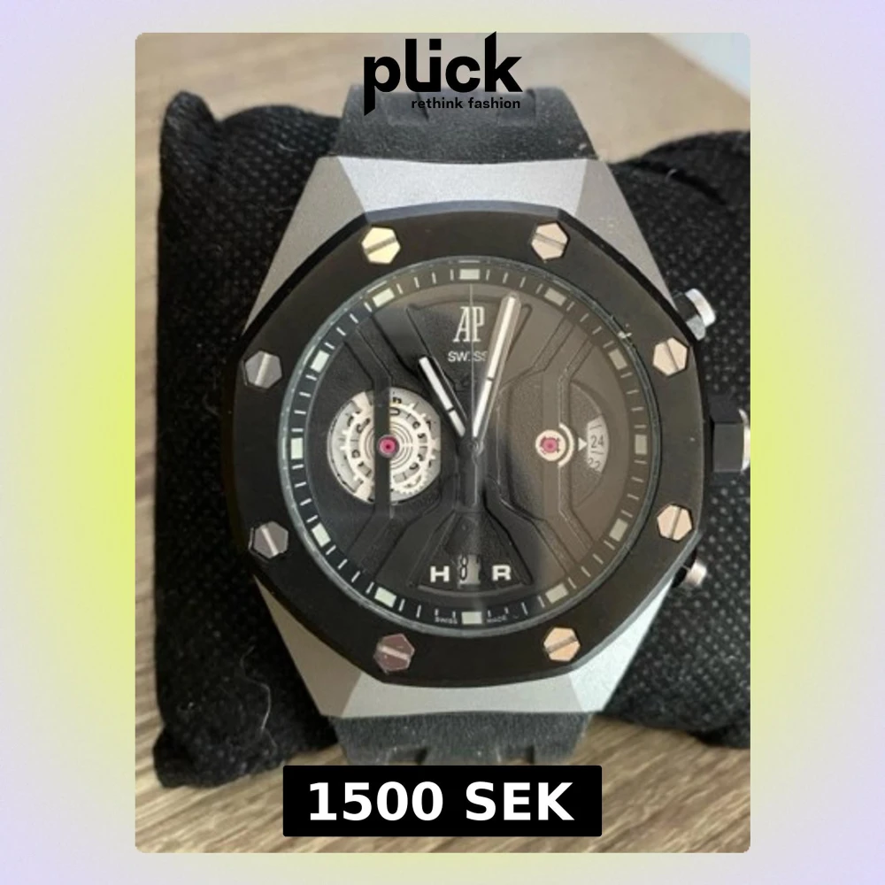 Snygg och robust herrklocka från Audemars Piguet med svart urtavla och silverfärgade detaljer. Klockan har en unik geometrisk form, tydliga index och en cool mekanisk detalj på urtavlan. Svart armband i syntetmaterial och markerade skruvar runt boetten.